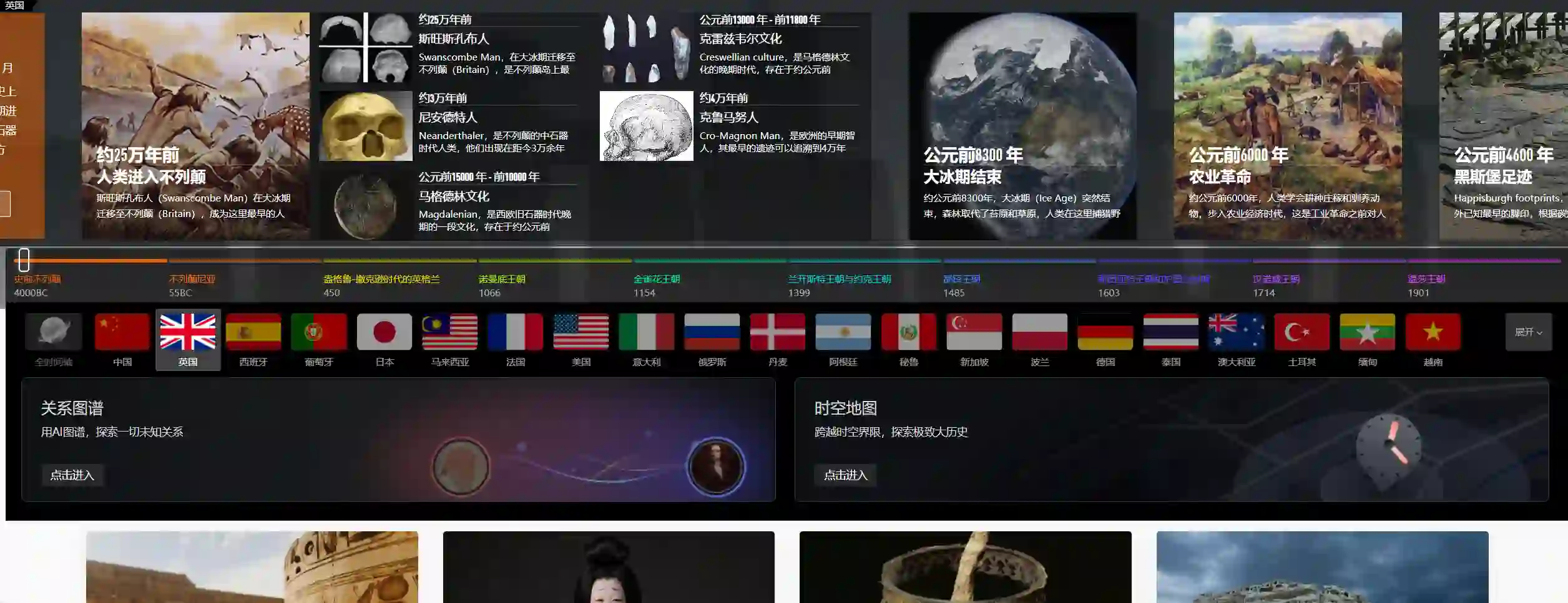一个可以从艺术、文化、历史人物等多重角度看各国历史的网站。这个网站最特别的一点就是它不是用单一时间视角来看待历史,你可以从艺术、书籍、人物、古籍等视角来看历史的发展,不仅能做纵向的对比,还能横向看待历史文明的发展进程,对于宏观了解历史很有帮助
